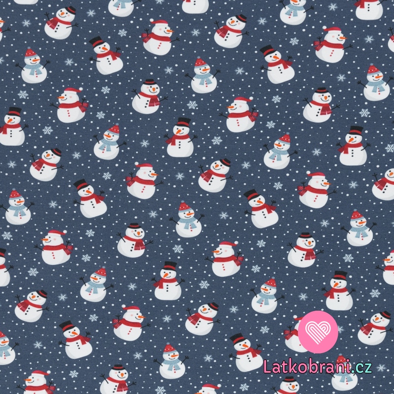 Teplákovina potisk sněhuláci mezi vločkami na modré, lehce počesaná