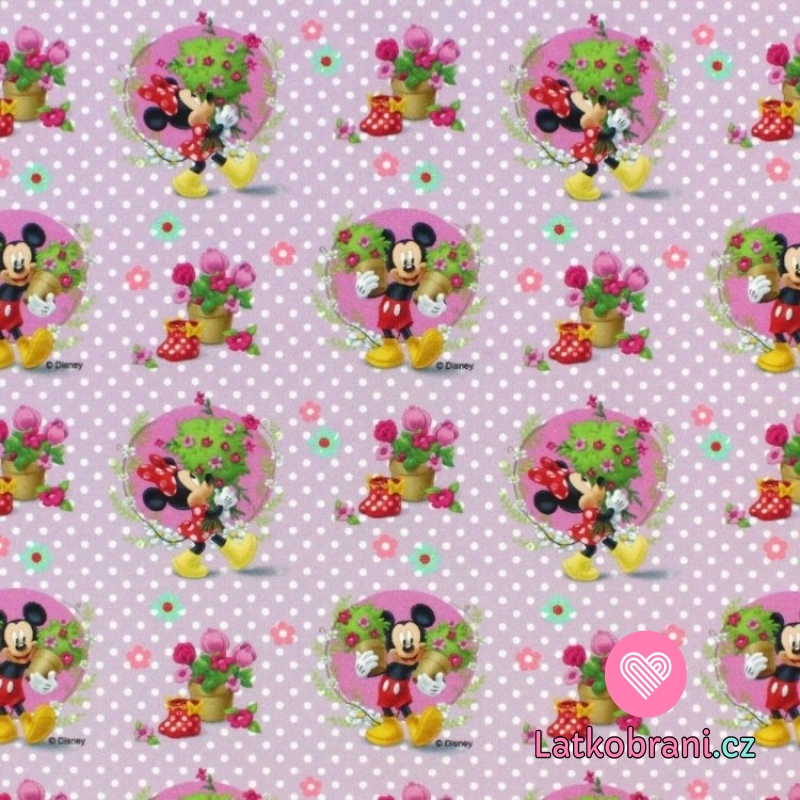 Úplet potisk Mickey a Minnie zahradníci mezi puntíky na růžové