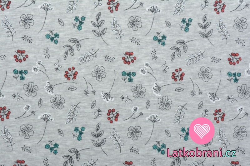 Warmkeeper potisk kvítka, větvičky a bobulky na šedém melé