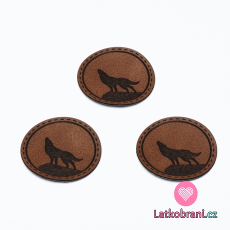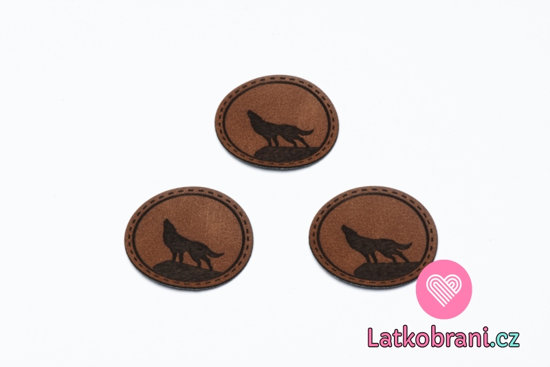 Štítek na oblečení vlk, kulatý, koženkový, hladký povrch