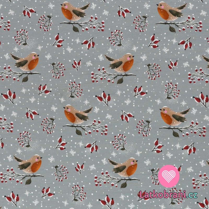 Úplet potisk ptáček na zamrzlém šípkovém keři na šedé