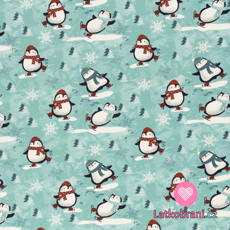 Teplákovina počesaná potisk tučňáci na bruslích na modré