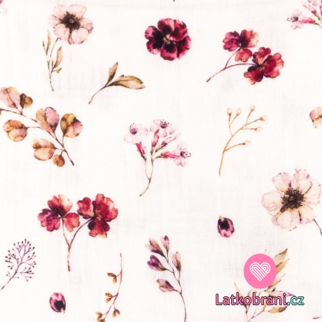 Dvojitá gázovina / mušelín růžové květy na bílé