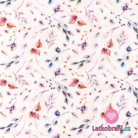 Dvojitá gázovina/mušelín pastelově barevné lístečky na bílé