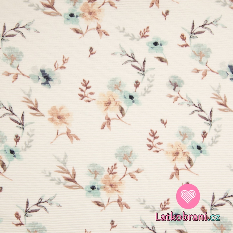 Žebrovaný úplet (ottoman) potisk modré kytičky na bílé