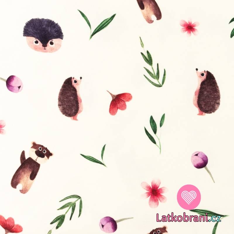 Úplet potisk ježeček a méďa mezi květy a listy na bílé