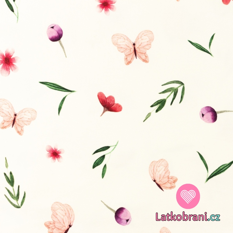 Úplet potisk poletující motýli, lístečky a tulipány na bílé