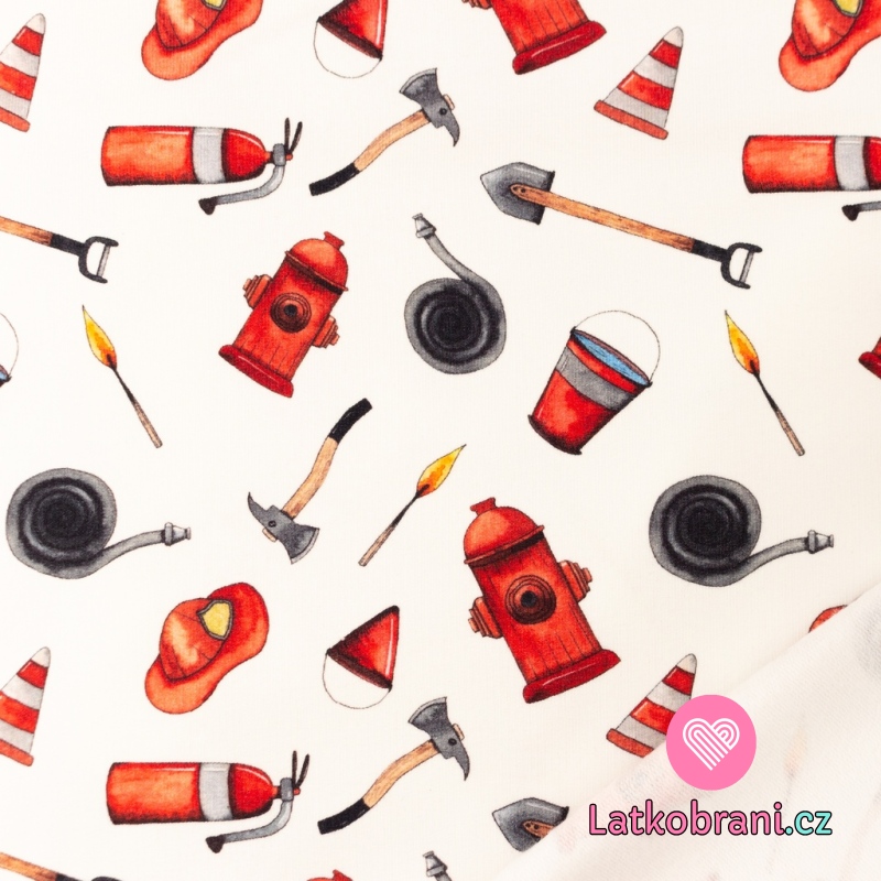 Teplákovina počesaná potisk hasičská výzbroj na bílé