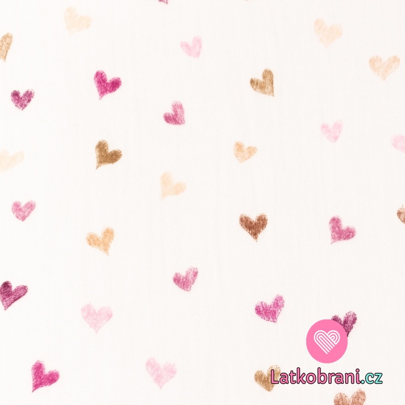 Dvojitá gázovina / mušelín malovaná srdíčka do růžova na bílé