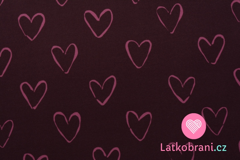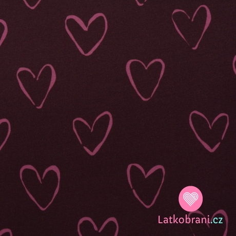 Teplákovina růžová srdíčka na tmavě fialové, lehce počesaná