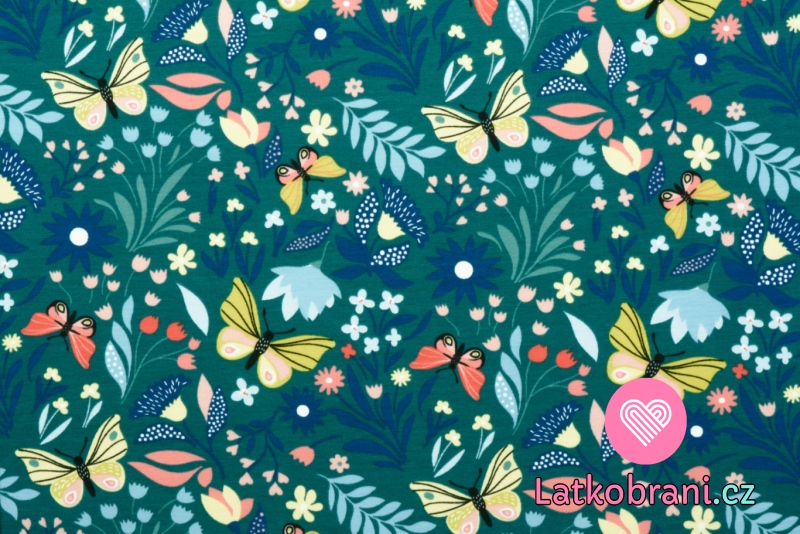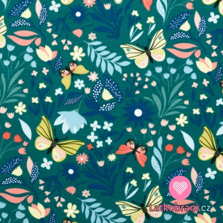 Teplákovina potisk motýlci a květiny na petrolejově modré
