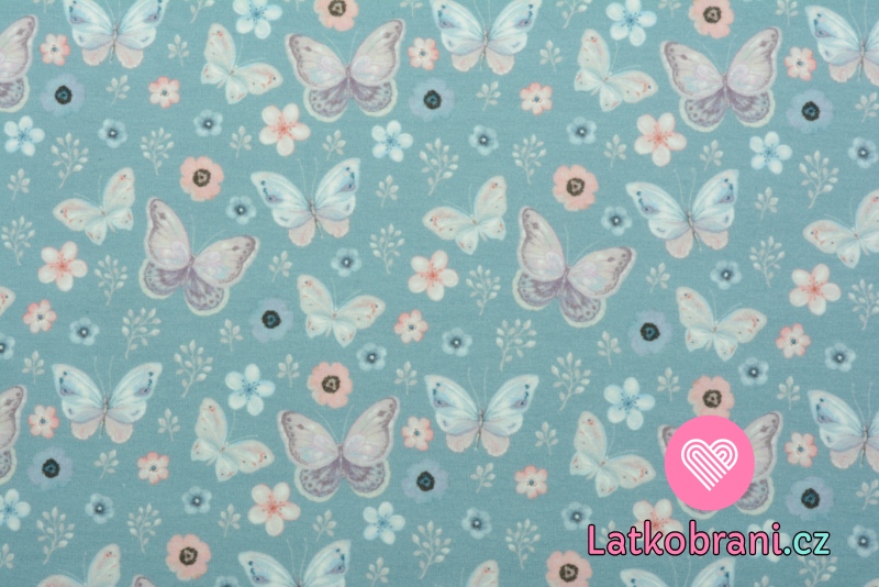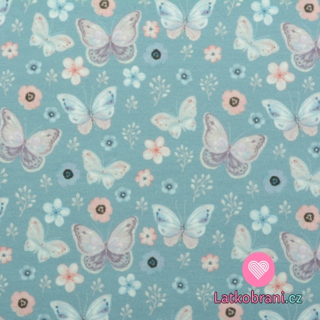 Úplet potisk motýlci a květy na modré, BIO
