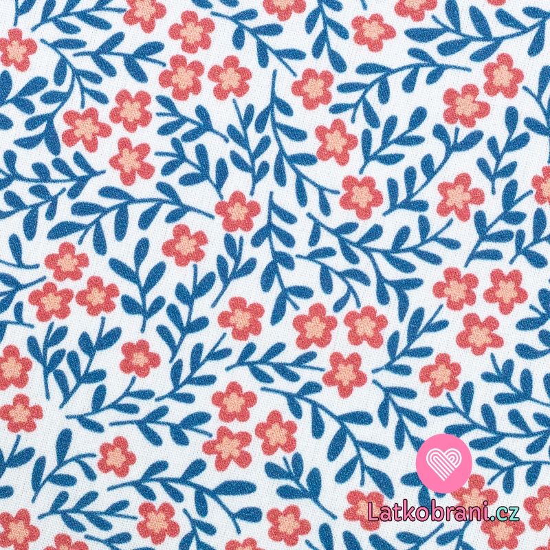 Bavlněné plátno růžovo - červené květiny s modrými listy na bílé