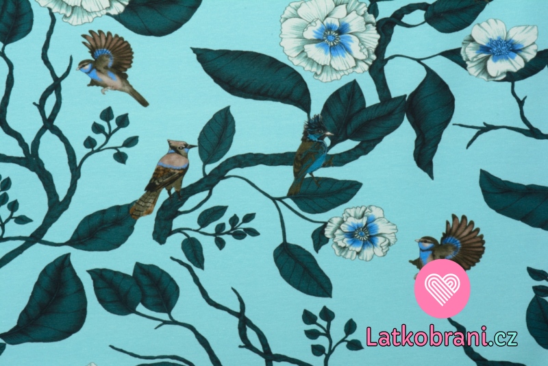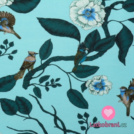 Úplet potisk květy a ptáčci na modrém podkladu