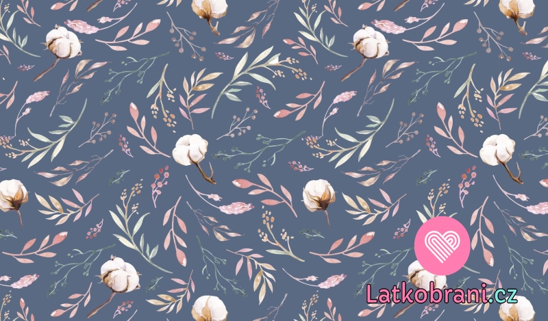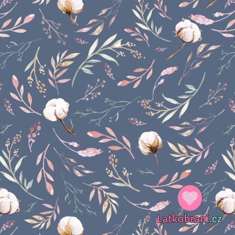 Úplet potisk květy bavlníku na tmavě modré jeans