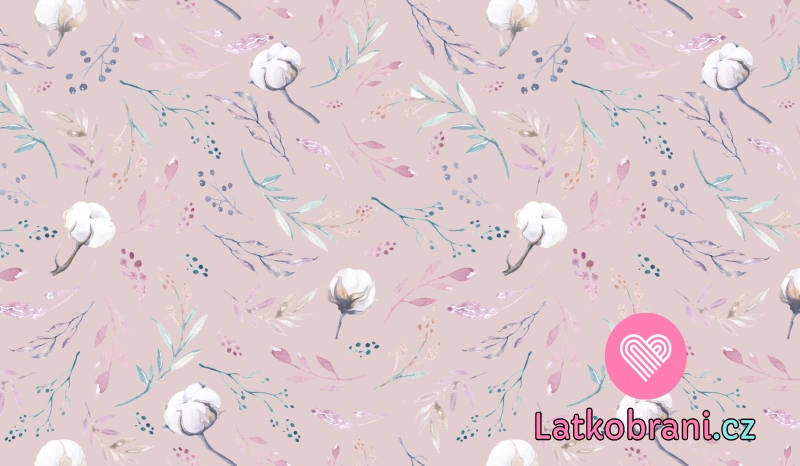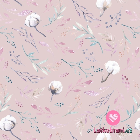 Úplet potisk květy bavlníku na světlé starorůžové