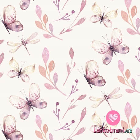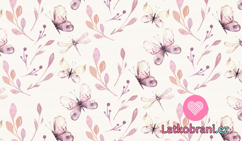 Teplákovina potisk motýli mezi větvičkami na ecru