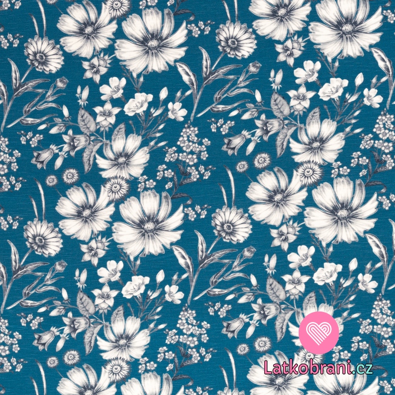 Viskózový úplet potisk jarní květiny na modré