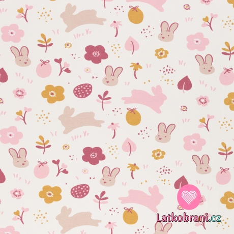 Úplet potisk velikonoční zajíček a vajíčka mezi kytičkami na smetanové