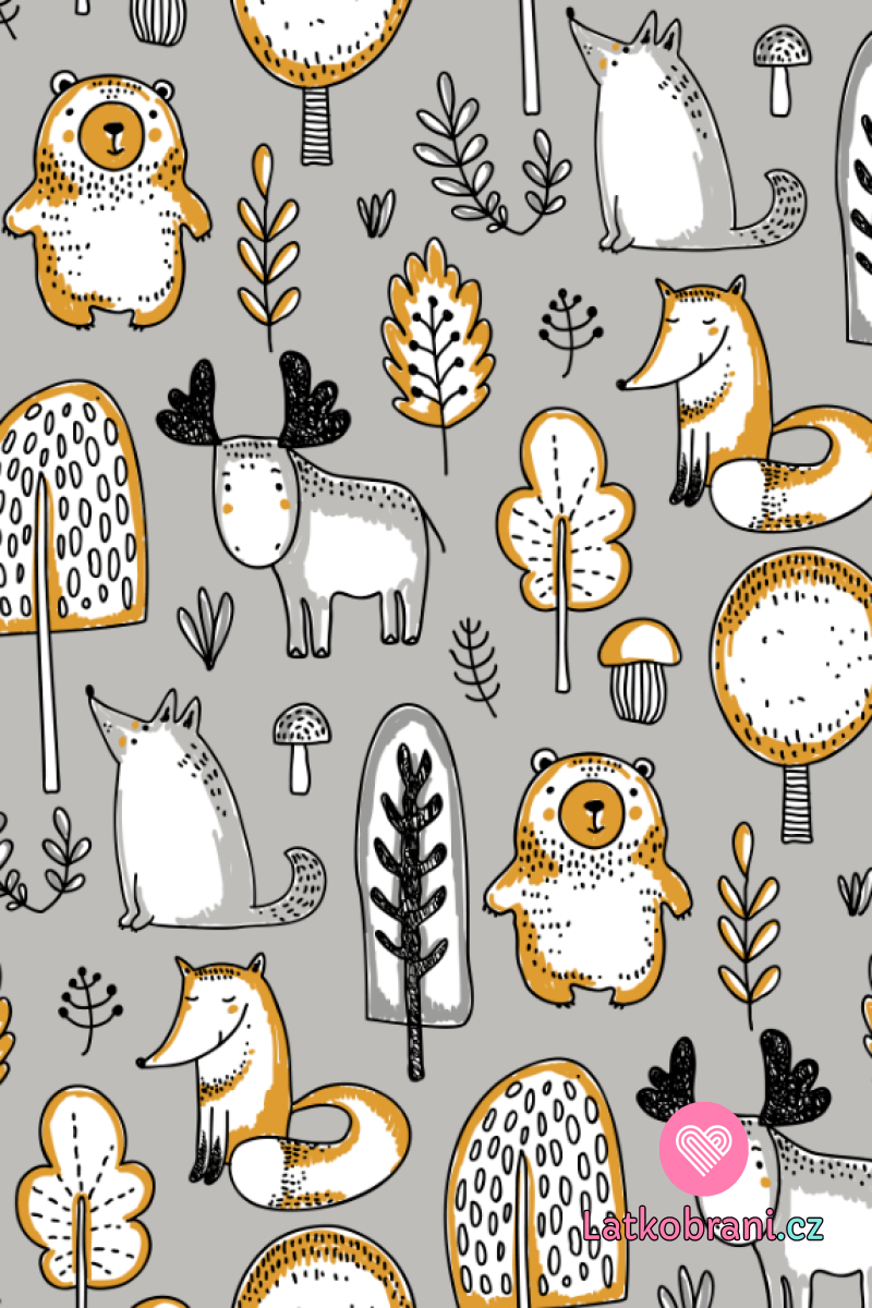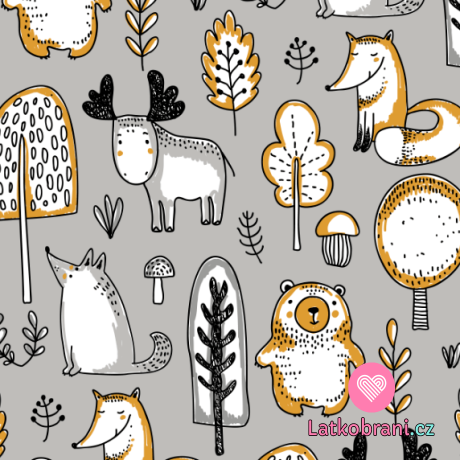 Teplákovina potisk zvířátka v lese v okrovo - šedé
