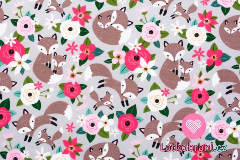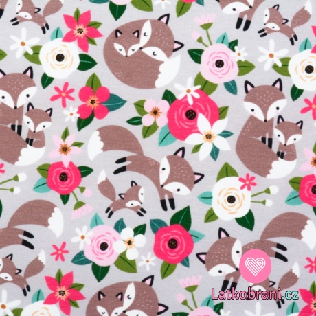 Teplákovina potisk lištičky mezi kvítky na šedé