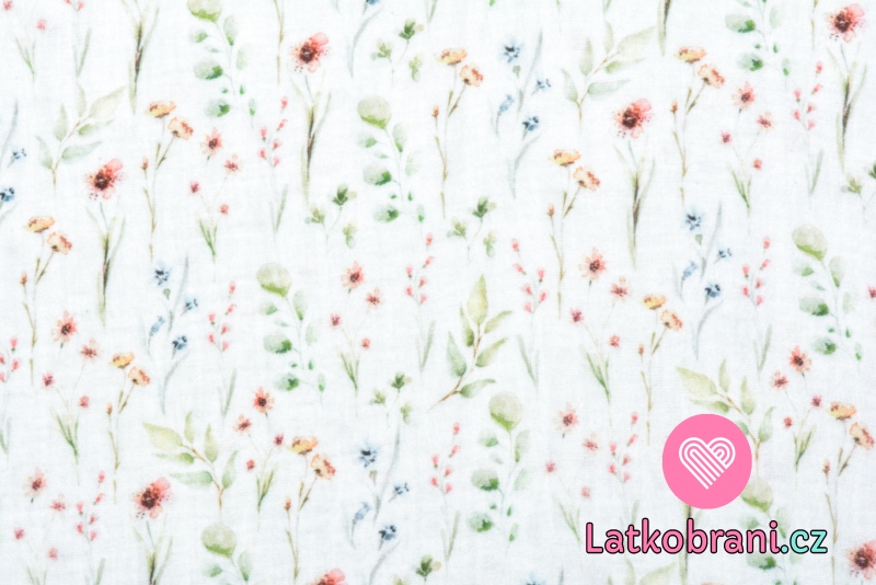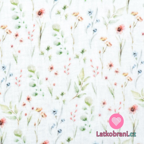 Dvojitá gázovina / mušelín luční květiny na bílé
