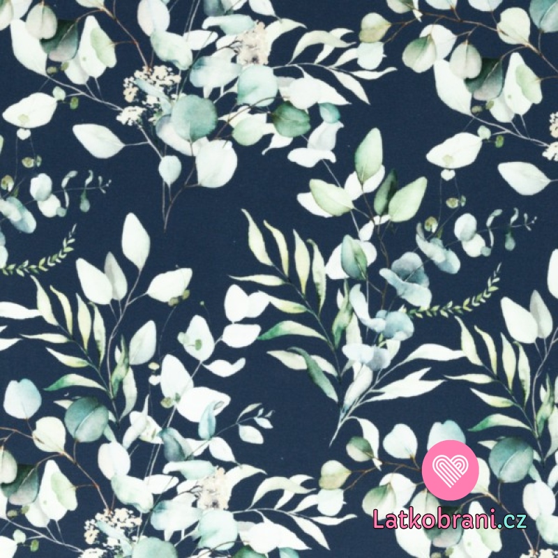 Teplákovina potisk eukalyptové listy na tmavě modré