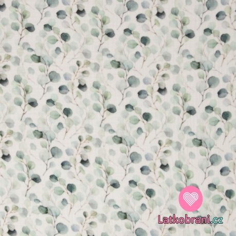 Dvojitá gázovina / mušelín větvičky eukalyptu na bílé