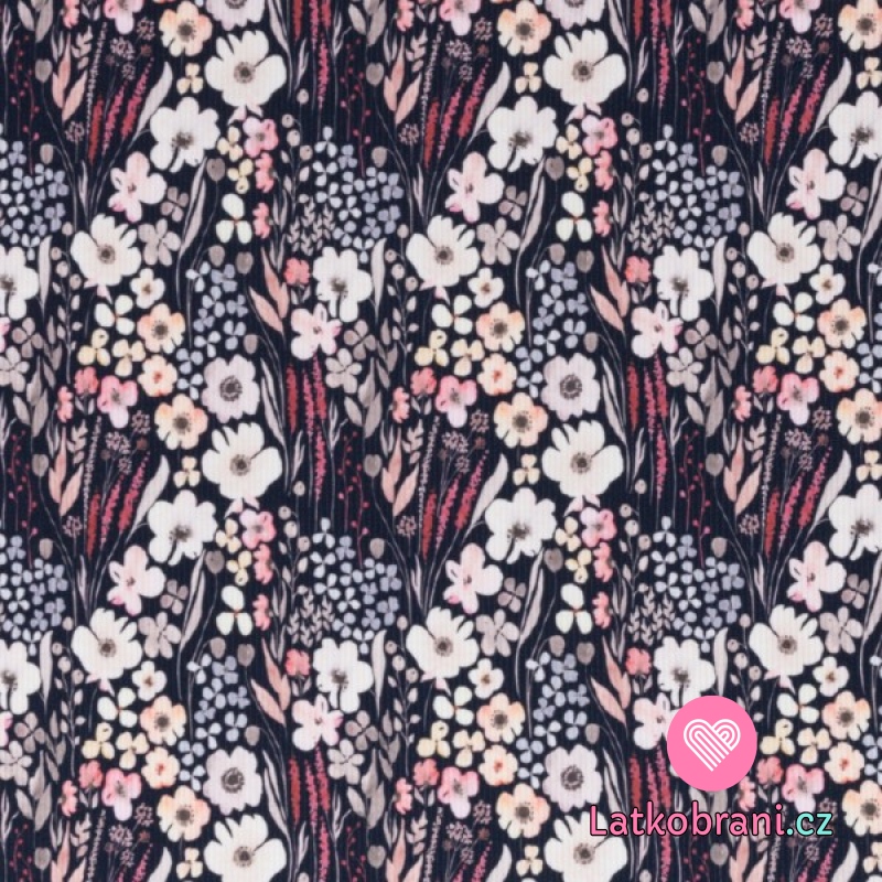 Žebrovaný úplet květinová louka na tmavě modré