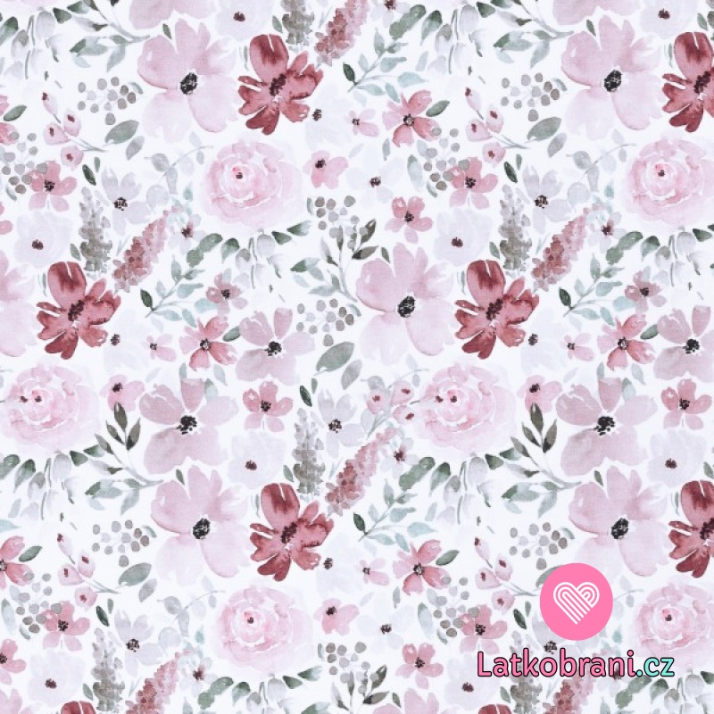 Teplákovina potisk růžové růže a květiny na bílé