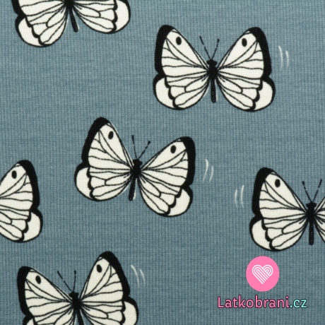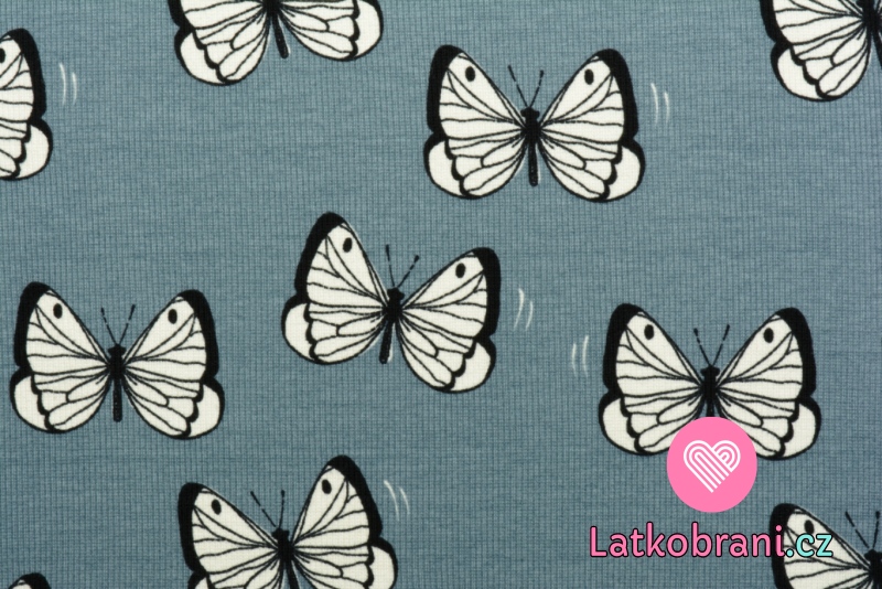 Žebrovaný úplet potisk motýlci na modré, BIO