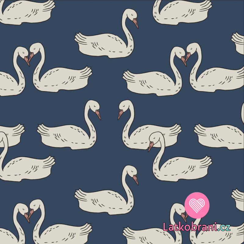 Žebrovaný úplet potisk zamilované labutě na tmavě modré, BIO