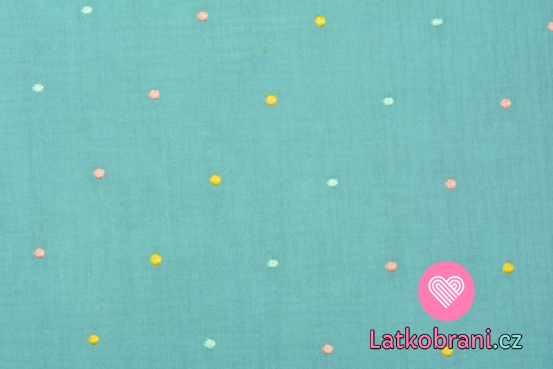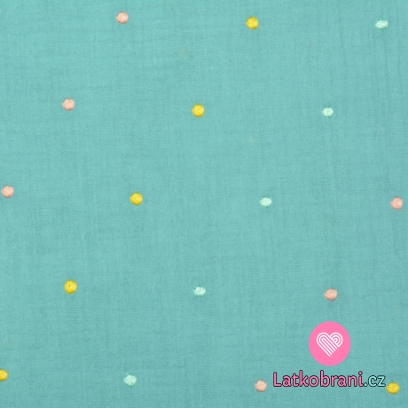 Dvojitá gázovina / mušelín vyšívané puntíky na modrozelené