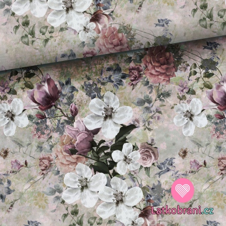 Teplákovina potisk jabloňové květy na šedé