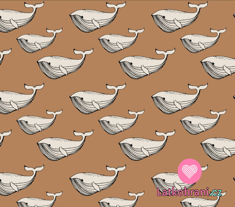 Žebrovaný úplet potisk velryby na karamelové, BIO