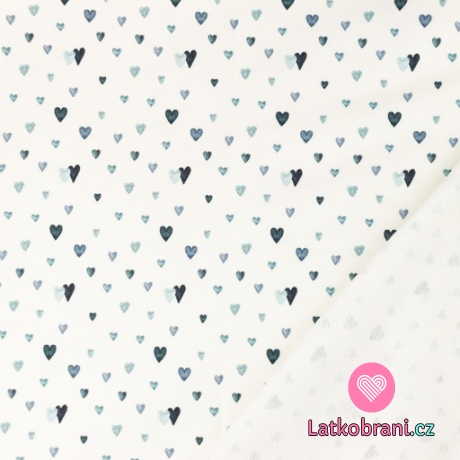 Teplákovina modrá srdíčka na bílé