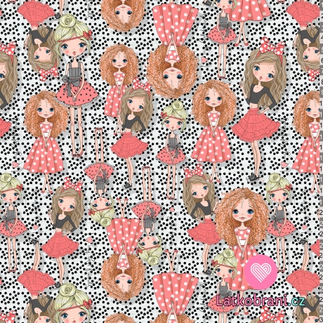 Teplákovina potisk dívky mezi černými puntíky na bílé