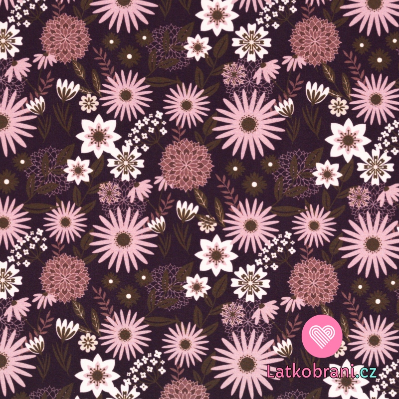 Modálová teplákovina růžové a bílé květiny na vínovo - fialové