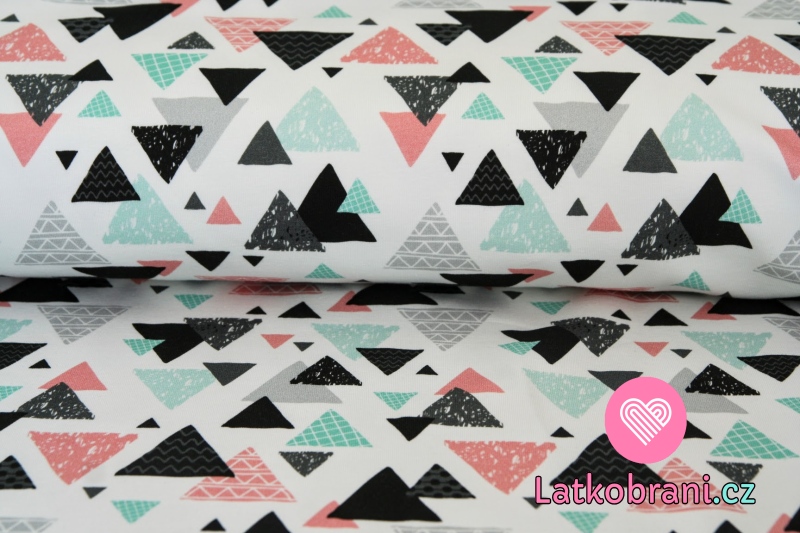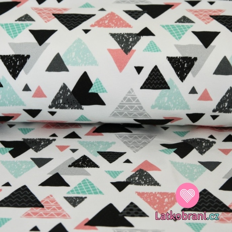 Teplákovina smaragdové, růžové a černé trojúhelníčky