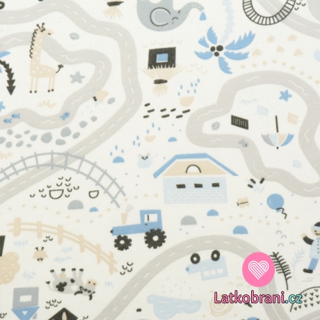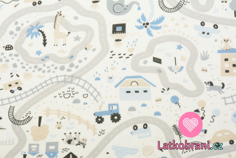 Bavlněný úplet potisk modrý vláček na smetanové