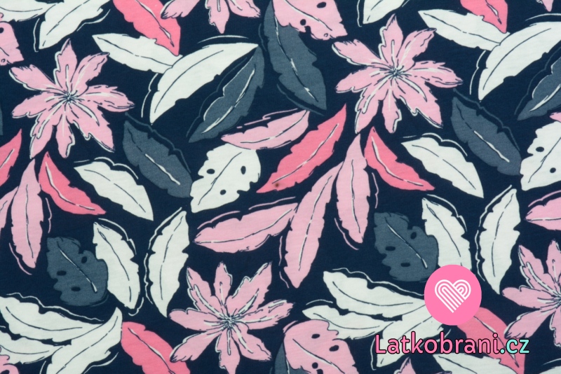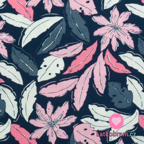 Bavlněný jednolícní úplet potisk banánové listy na modré