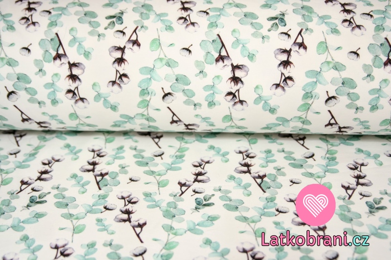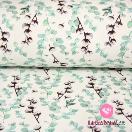 Teplákovina větvičky modré a bavlny na smetanové