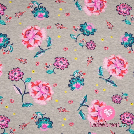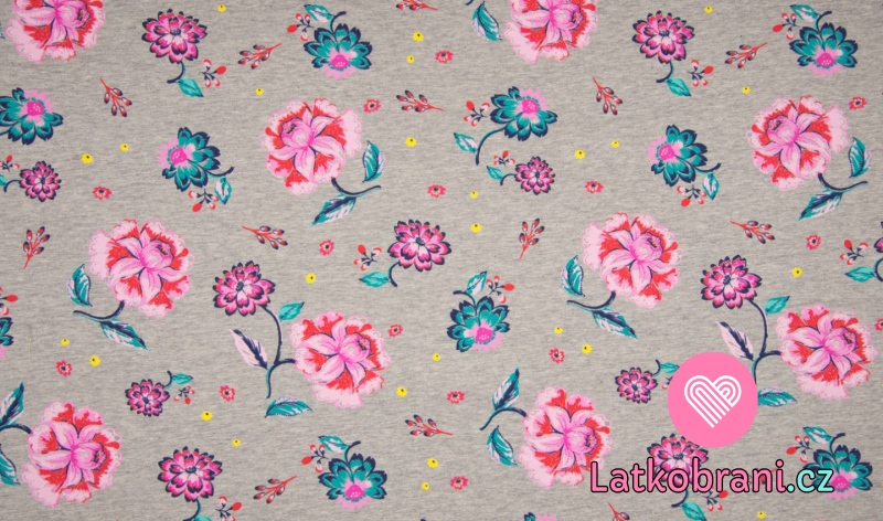 Teplákovina počesaná růžové květy na šedé melé