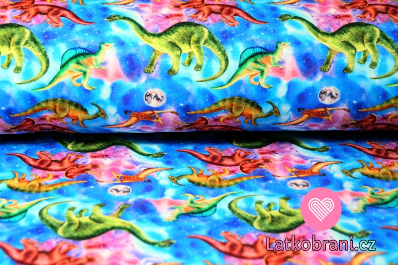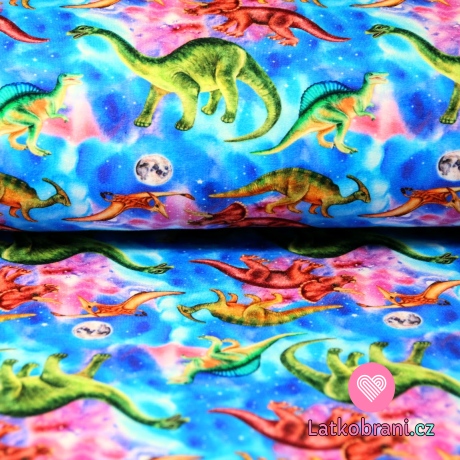 Teplákovina POČESANÁ dinosauři na duhovém podkladu