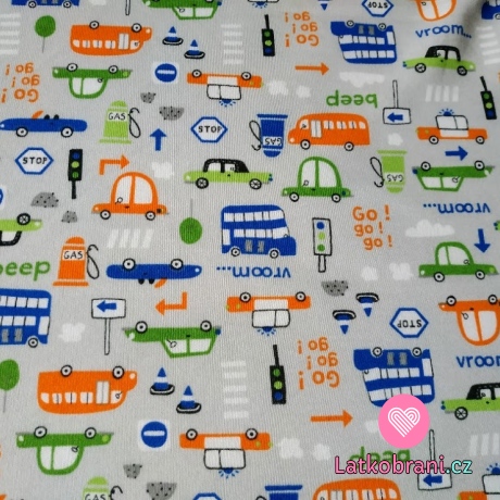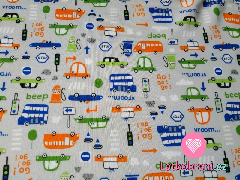 Bavlněný úplet auta s dopravními značkami na světlince šedé
