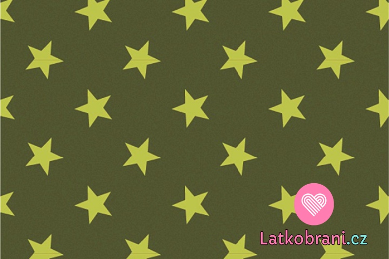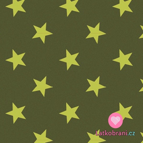 Teplákovina potisk neonově zelené hvězdičky na khaki zelené