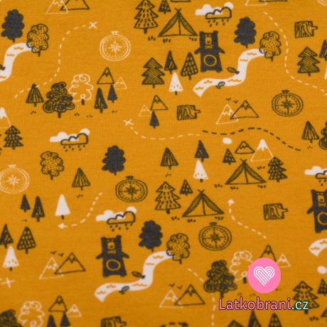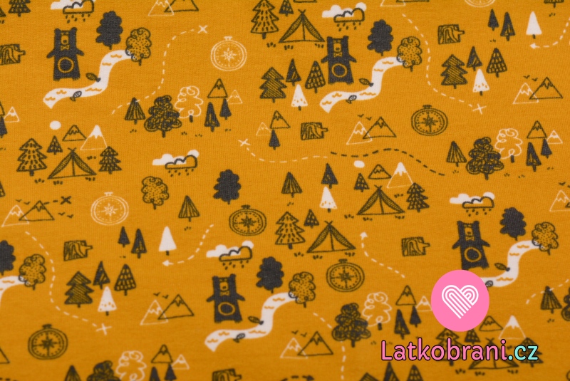 Teplákovina počesaná medvídci mezi stromy a stany na hořčicové