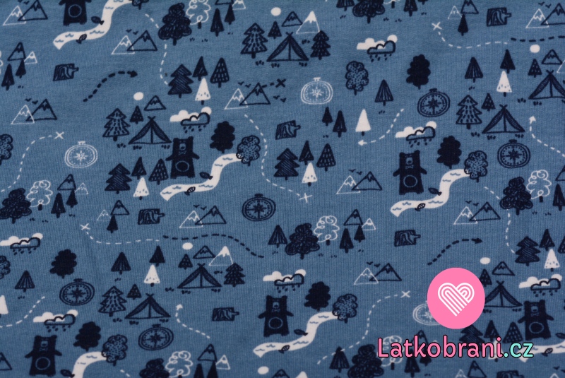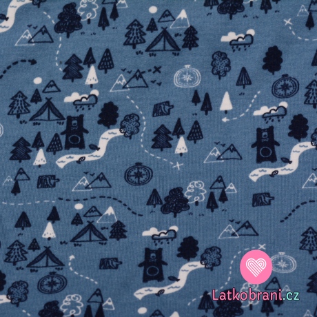 Teplákovina počesaná medvídci mezi stromy a stany na modré