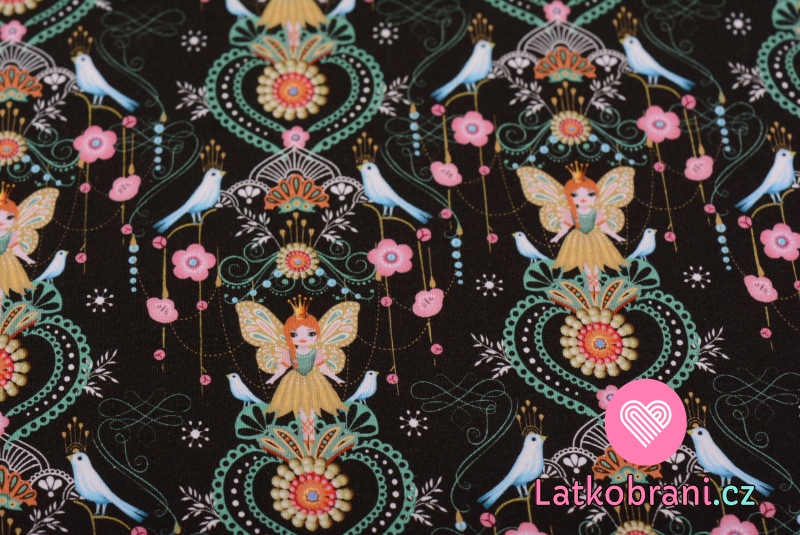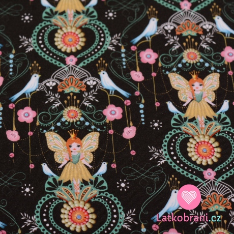 Teplákovina počesaná motýlí princezna s ptáčky mezi kvítky na černé