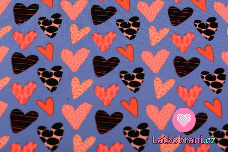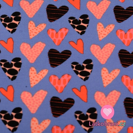 Teplákovina potisk barevná výrazná srdíčka na modrofialové